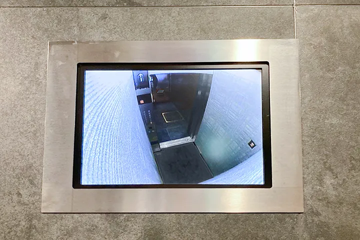 1階のエレベーターホールからエレベーター内を確認できるモニターを設置しています。