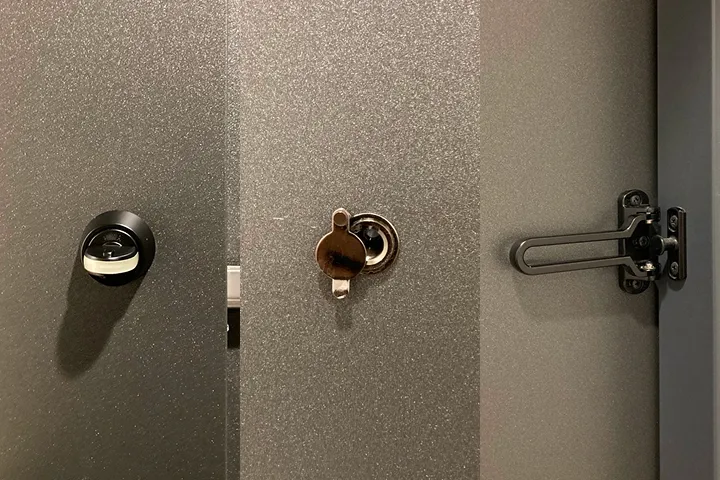 玄関ドアはドアスコープ、ドアガード、防犯サムターン、防犯錠前扉を装備しています。